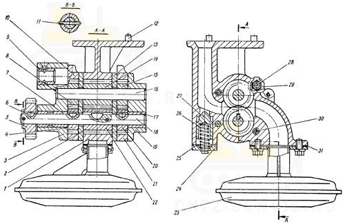 Вытрите краску, вложите в гнездо корпуса 1 клапан 27 пружину 26. Установите регулировочные прокладки 25, крышку 24 и закрепите болтами со стопорными шайбами. Регулируйте клапан при обкатке масляного насоса изменением количества прокладок 25.
