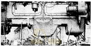 Расшплинтуйте и отверните корончатую гайку 5 крепления маслоприемника 6 к кронштейну 8. Снимите шайбу 7, пружину 4 и маслоприемник. Если сняты обе части картера, то маслоприемники могут быть сняты вместе с масляным насосом как одна сборочная единица. Центральный маслоприемник может быть снят отдельно, через люки передней части картера.