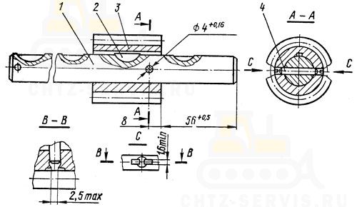 Высверлите расклепанную часть штифта 4 (рис. 72) сверлом диаметром 5 мм и выбейте его из шестерни 2. Снимите с валика 51-09-132СП шестерню 2 и выбейте из гнезда шпонку 3.