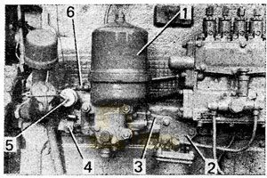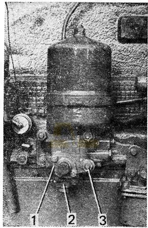 Снимите с плиты масляную центрифугу 1 (рис. 66) и фильтр грубой очистки топлива ФТ-25 с кронштейном 2.