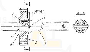 Посадите в отверстие шестерни 2 и валика 1 штифт 4 и расклепайте с двух сторон.