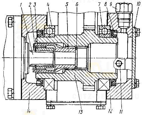Отверните четыре гайки 3 крепления переднего фланца 14 (рис. 18) и снимите его со шпилек корпуса шестерен распределения. Выньте из полости вала 13 промежуточную муфту 5 вместе с муфтой 3. Отверните четыре гайки крепления заднего фланца 12 и снимите его со шпилек.