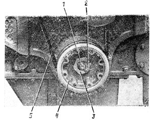 Установите на носке коленчатого вала шпонку 34107 и посадите на вал шкив 4. Закрепите шкив специальным болтом 3, смазав предварительно его резьбу графитовой смазкой. Законтрите специальный болт болтом 1 (с левой резьбой) и замковой пластиной 2, отогнув короткий конец пластины на грань болта. Наденьте ремни 5 привода вентилятора и отрегулируйте их натяжение.