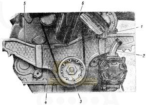 Отверните специальный болт 3 и снимите шкив 4 с носка, коленчатого вала при помощи съемника. Выбейте, при необходимости, шпонку из паза на носке коленчатого вала.