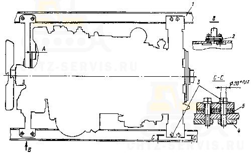 Установите прокладки между лапами опоры и лонжеронами, рамы трактора, совместив отверстия в опоре и прокладках с отверстиями в лонжеронах. Отпустите переднюю часть дизеля на лонжероны трактора.