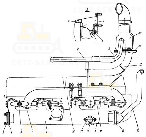 Можно снимать выпускной коллектор 18 в сборе с турбокомпрессором ТКР-11Н3, выпускным патрубком 12 и выхлопной трубой 10. Не выбивайте технологические заглушки 16 во впускном коллекторе без надобности.