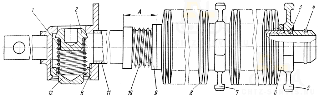 Вставьте в отверстие корпуса клапана клапан 2. Установите на клапан пружину 1 и заверните пробку 12. Отрегулируйте на стенде затяжку пружины клапана так, чтобы он срабатывал при давлении 150...200 кПа (1,5...2,0 кгс/см²).