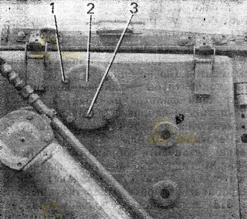 Установите собранный фильтр в отверстие правого гидробака 48-26-210СП до упора фланца корпуса перепускного клапана во фланец стяжной трубы гидробака. Закройте отверстие крышкой 2 ( см. рис. 318 ) с резиновым кольцом. Закрепите крышку четырьмя болтами 1 с пружинными шайбами. Заверните пробку 3.