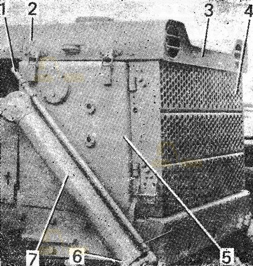 Присоедините гидробаки стропами к подъемнику ( рис. 317 ). Отверните шестнадцать болтов крепления гидробаков к лонжеронам. Приподнимите гидробаки и, выводя перепускную трубу из лонжеронов, снимите их.