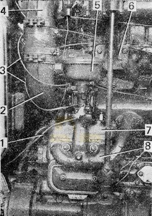 Снимите воздухоочиститель 5 пускового двигателя. Отсоедините тяги 1, 3 и бензопровод от карбюратора. Отверните два болта и две гайки, крепящие впускной и выпускной коллекторы пускового двигателя, и снимите коллектор 8 вместе с карбюратором. Отсоедините резиновый шланг сигнализатора засоренности от воздухоочистителя и снимите воздухоочиститель дизеля. Отверните четыре болта, крепящие верхний патрубок 4 к турбокомпрессору ТКР-8,5 51-54-1СП, и четыре болта, крепящие нижний патрубок 2 к впускному коллектору дизеля, снимите патрубки и правый кронштейн воздухоочистителя дизеля. Отверните четыре болта, крепящие сливную трубу к головкам цилиндров дизеля, и два болта, крепящие к головке цилиндров пускового двигателя, и снимите ее. Отсоедините от турбокомпрессора трубку подвода масла и провод датчика давления масла перед турбокомпрессором. Ослабьте хомут на рукаве трубки слива масла от турбокомпрессора. Отверните две гайки со шпилек крепления головки цилиндров и одну гайку со шпильки крепления впускного и выпускного коллекторов, снимите задний кронштейн воздухоочистителя дизеля и прижимную планку.