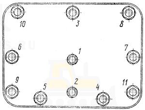 Протрите чистой салфеткой плоскости разъема головки и блока. Наденьте на шпильки медно-асбестовую прокладку и уложите ее на плоскость разъема блока цилиндров 17-01-109 отбортовкой вверх. Убедитесь, нет ли посторонних предметов в цилиндрах и на прокладке, закройте пластмассовыми пробками отверстия под свечи в головке цилиндров и установите головку 7 на шпильки блока. Наденьте проушиной на заднюю шпильку защитную трубку с проводами высокого напряжения, наверните на шпильки и затяните гайки крепления головки цилиндров в два приема в порядке, показанном на рис. 111.