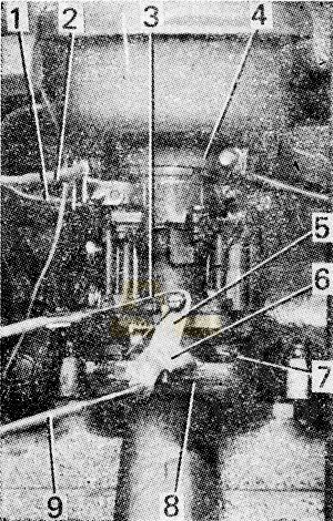 Отсоедините тросик управления 2 от кронштейна и рычага воздушной заслонки, тросик управления 3 от кронштейна и рычага 5 ограничения хода дроссельной заслонки карбюратора. Отсоедините от рычага 6 дроссельной заслонки тягу регулятора 9, не изменяя ее длины. Снимите с карбюратора воздухоочиститель 17-05-184СП, ослабив хомут 4, отверните две гайки крепления 7 и снимите щиток карбюратора и карбюратор с фланцевой прокладкой 8 со шпилек всасывающего коллектора.