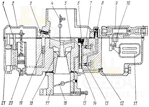 - Фланцевые прокладки карбюратора:19 — между крышкой и корпусом поплавковой камеры, 17 — между корпусом поплавковой камеры и корпусом смесительной камеры не должны иметь разрывов и смятий.