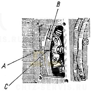 Запрессуйте в блок-картер два штифта 9 для фиксирования корпуса распределительных шестерен. Снимите крышку люка на корпусе муфты сцепления 17-73-7СП пускового двигателя и, проворачивая коленчатый вал, установите поршень первого цилиндра в конце такта сжатия, совместив при этом метку С (рис. 121) «ВМТ-1Ц» на ободе маховика с меткой А (риской) на люке корпуса муфты сцепления.
