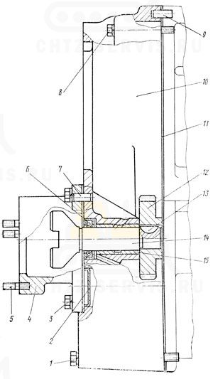 Отверните три болта 3 и снимите с двух установочных штифтов 7 кронштейн 4 с фланцевой прокладкой. Спрессуйте при помощи съемника шестерню 12 с валика привода магнето 14. Выньте шпонку 13 из паза валика и извлеките валик привода магнето из корпуса. При необходимости выпрессуйте втулку 15, сальник 6 в сборе и заглушку 2 из отверстий в корпусе распределительных шестерен.