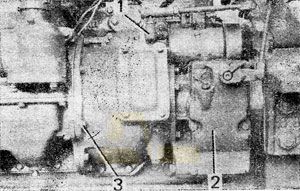 Снимите пусковой двигатель с дизеля. Снимите стартер и редуктор 2 (рис. 128). Выверните семь болтов 3 крепления корпуса муфты сцепления и снимите корпус со штифтов блока двигателя.