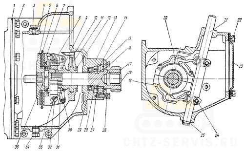 Отогните усики стопорной шайбы 27 из шлиц гайки 28 и отверните гайку с вала. Спрессуйте подшипник 208А с вала и снимите крышку 15.