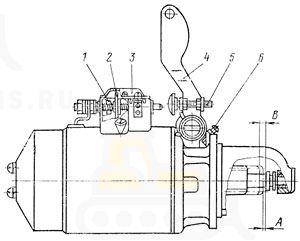 При этом зазор А между шестерней привода и упорным кольцом на валу якоря должен быть не более 1 мм. Регулируйте вращением упорного винта 6, ослабив контргайку винта.Рис. 119. Регулирование включения стартера