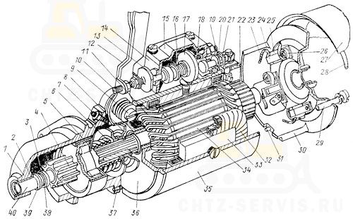 Снимите с вала. 40 якоря упорную шайбу 39, отодвиньте упорное кольцо 3 в сторону шестерни 4 и снимите замковое кольцо 38, после чего снимите с вала якоря привод в сборе с шестерней 4, муфтой 5 свободного хода и муфтой 8 включения привода. Снимите диск 36 промежуточного подшипника.