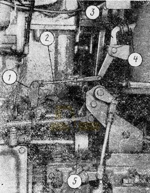 Поверните рычаг 3 механизма привода стартера до касания в упор 4. В этом положении отрегулируйте длину тяги 2 до совпадения отверстия в тяге с отверстиями рычага включения 1, который должен находиться в крайнем выключенном положении. Соедините тягу 2 с рычагом 1 пальцем, зашплинтуйте палец и застопорите тягу гайкой.