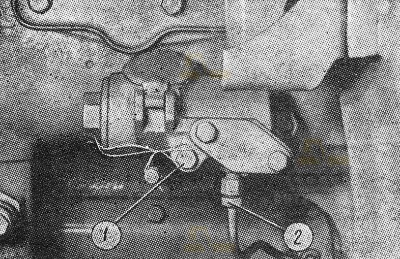 Отсоедините от работомера 16-72-1СП вентиляционную трубку 2 ( рис. 143 ). Выверните два болта 1 крепления и снимите работомер с прокладкой с корпуса регулятора.