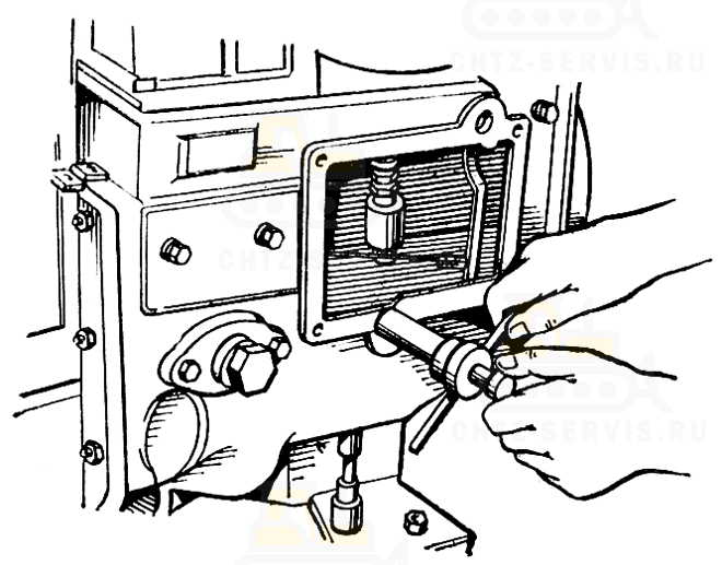 Установите крышку бокового люка корпуса регулятора с прокладкой и закрепите крышку болтами с пружинными шайбами.