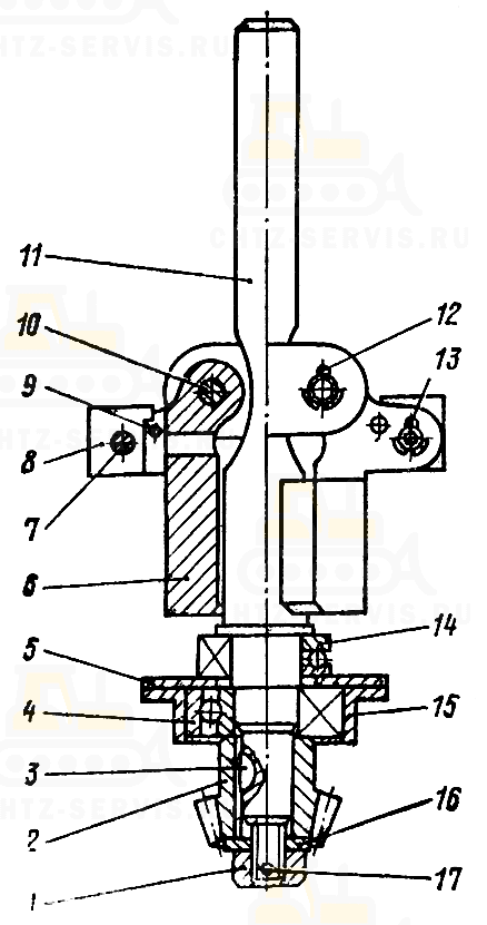 Отсоедините грузы 6 ( рис. 171 ). Отсоедините сухарики 8 от грузов регулятора. Выньте шплинт 17 и отверните корончатую гайку 1. Снимите съемником коническую шестерню 2. Снимите корпус 15, шариковый подшипник 4 и упорный фланец 5.