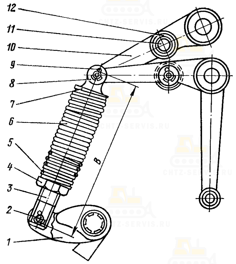 Смажьте резьбу тяги 5 маслом и наверните на нее гайку и вилку. Заворачивая или отворачивая вилку тяги, установите расстояние между осями в вильчатом конце тяги и вилке (224±0,5) мм, законтрите вилку гайкой. Проверьте отклонения от параллельности осей отверстий в вилках тяги, которое допускается не более 0,5 мм на длине 100 мм. Для устранения отклонения от непараллельности допускается подгибка тяги.
