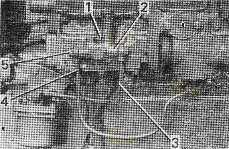 Выверните ручной подкачивающий насос 1 и пробку 21 с прокладками 2. Выньте два клапана 4 с пружинами 3.