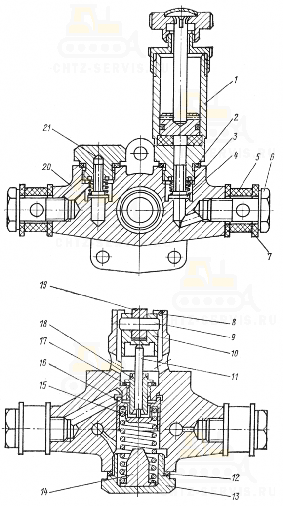 Выверните болты 700-41-2716 6 и снимите защитные детали 5, 7. Отверните пробку 13 и выньте из корпуса упор 14 с пружиной 15, поршень 16 со стержнем 11. Выпрессуйте штифт 8 и выньте толкатель 10 в сборе с роликом 19 и осью 9. Выверните из корпуса втулку 18 с прокладкой 17.