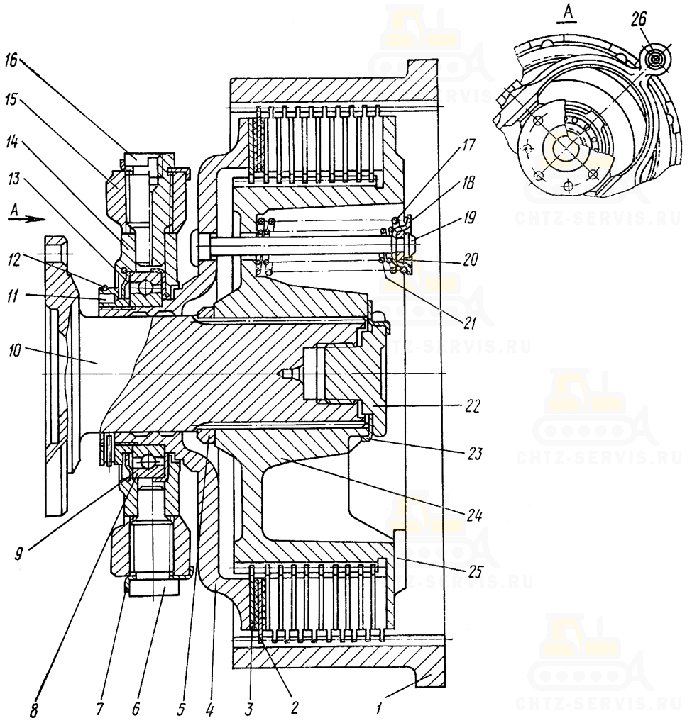 Отверните болты 6 и 11 ( см. рис. 230 ), за исключением одного с каждой стороны бортового фрикциона. При этом широкий паз 25 ( см. рис. 232 ) на торце внутреннего барабана 24 должен находиться в нижнем положении для того, чтобы при снятии бортового фрикциона через этот паз прошла пробка крепления фланца ведущей шестерни бортового редуктора.