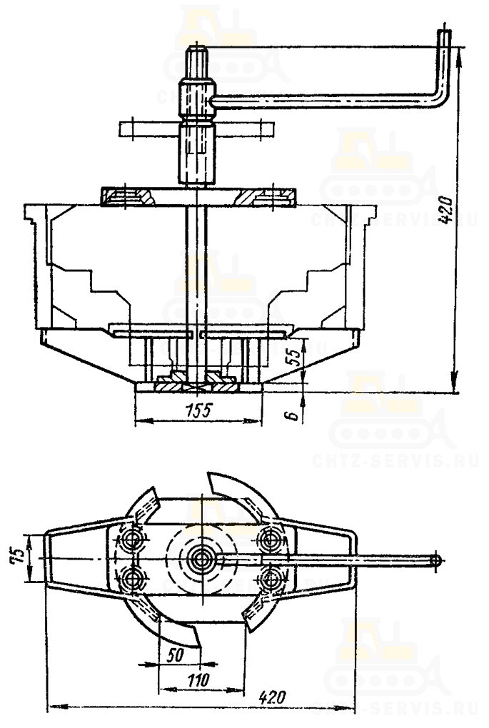 Установите на бортовой фрикцион приспособление ( рис. 234 ) и сожмите пружины. Выньте из выточек пальцев 19 ( см. рис. 232 ) сухари 20. Медленно поднимите шток приспособления до полного разжатия пружин 17 и 21, снимите тарелки 18 и пружины. Установите бортовой фрикцион на торец внутреннего барабана 24 и снимите нажимную тарелку 4, кольцо 5 и диски 2 и 5 с наружными и внутренними зубьями. Снимите замковое кольцо 12, отверните гайку 11 с нажимной тарелки и спрессуйте корпус 14 упорного подшипника 8 с подшипником в сборе с нажимной тарелки. Снимите замковое кольцо 9 и отражатель 13. Выпрессуйте упорный подшипник из корпуса стержнем диаметром 5 мм через два отверстия в корпусе.