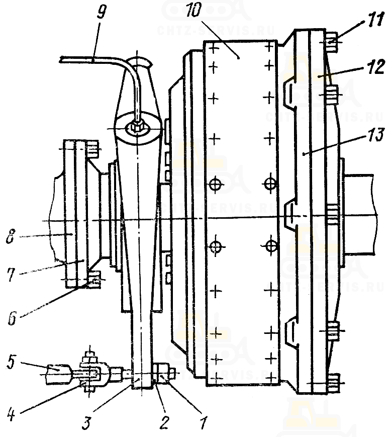 Отсоедините трубку 9 ( рис. 230 ) подвода смазки к рычагам 3 бортовых фрикционов 24-16-102сп. Отверните контргайку 1 и шаровую гайку 2. Отсоедините вилку 4 от рычага 5, отверните болты 6, прикрепляющие фланец полуоси 7 к фланцу 8 вала конической шестерни. Отверните торцовым ключом болты 11, крепящие наружный барабан 13 к ведущему фланцу 12, через отверстие в корпусе бортовых фрикционов, из которого была вывернута пробка 1 ( см. рис. 229 ).