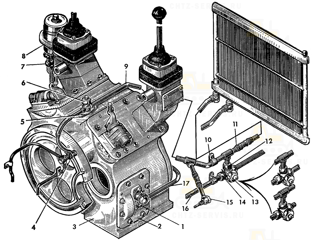 Выверните штуцер 4 и переходной штуцер 6. Снимите трубу 9 со штуцера 5. Выверните штуцер 15 (снизу, трактора) подвода масла к нижнему валу 24-12-105СП коробки передач 3. Выверните болт и снимите планку 10, отверните гайку 12 и ослабьте хомут 11 резинового шланга. Снимите трубу 9 с трактора. Выверните штуцер 1 и 7, отверните болт крепления хомута трубы 17 к корпусу коробки передач и снимите трубу с трактора. Выверните штуцер трубы 16 отвода масла от фильтра 8 коробки передач и гайку 14 от крана 13 и снимите трубу. Снимайте резиновые шланги с масляных труб только при их замене.