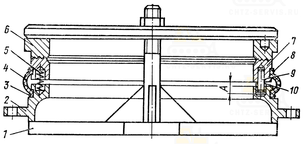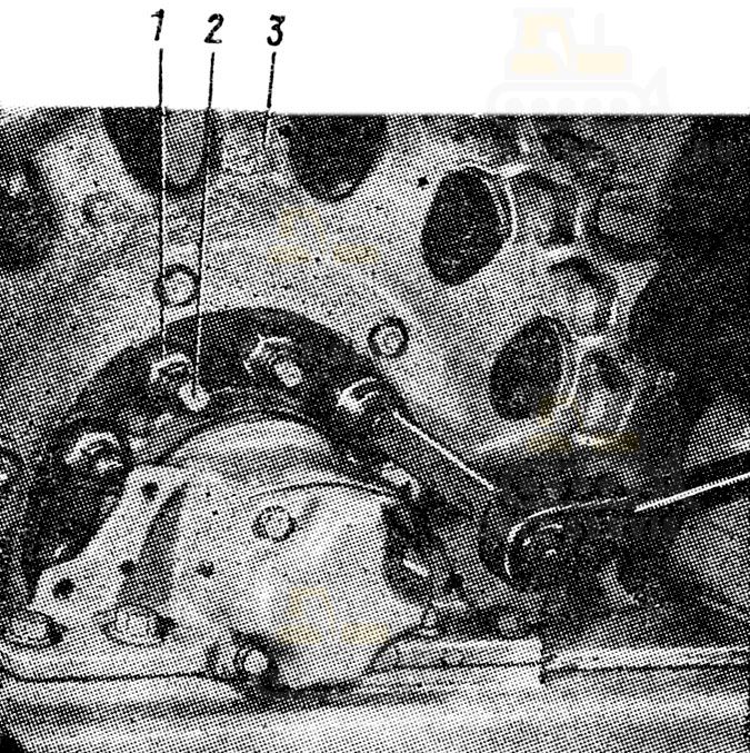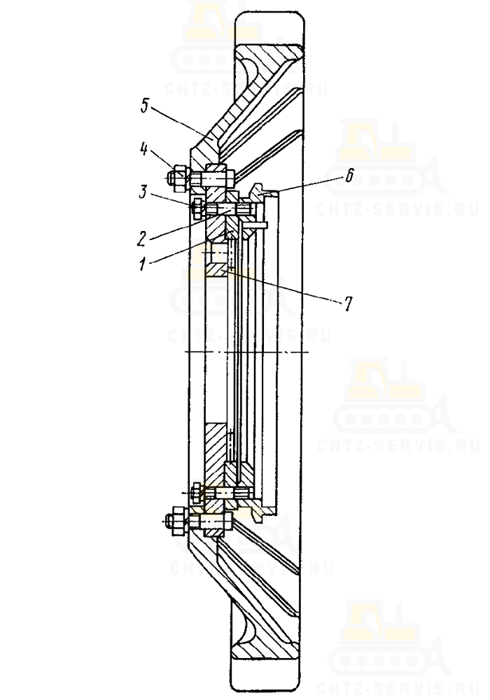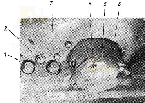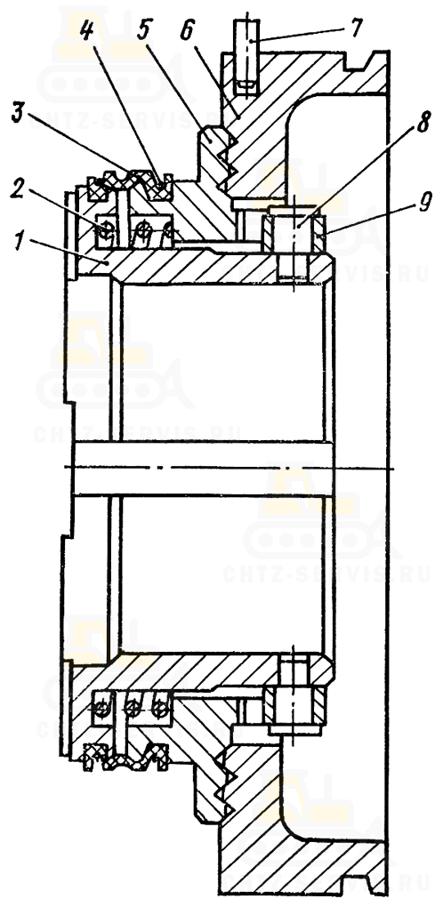 Поднимите корпус 6 бортовых фрикционов и подставьте под него надежную опору. Выверните шесть болтов 2 крепления защитного щитка и снимите щиток 3. Выверните четыре болта 4 креплений крышки концевого подшипника и снимите крышку 5 с прокладками.