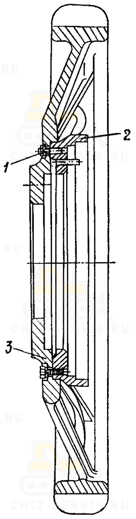 Лабиринт в сборе ( см. рис. 244 ) устанавливается непосредственно на ведущее колесо 3 ( рис. 245 ) и закрепляется на шпильках лабиринта 2 гайками 1 с пружинными шайбами. Момент затяжки гаек 40...60 Н • м (4...6 кгс • м).