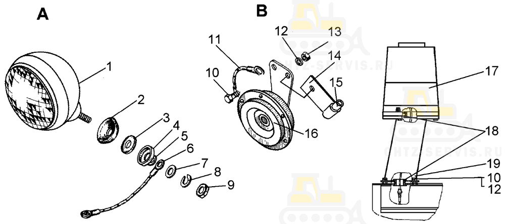 | 1 Для трактора с пусковым двигателем. 2 Для трактора с электростартерной системой пуска. 3 Для экспорта. 4 Для тропиков. 5 Входит в комплект фары. | |||