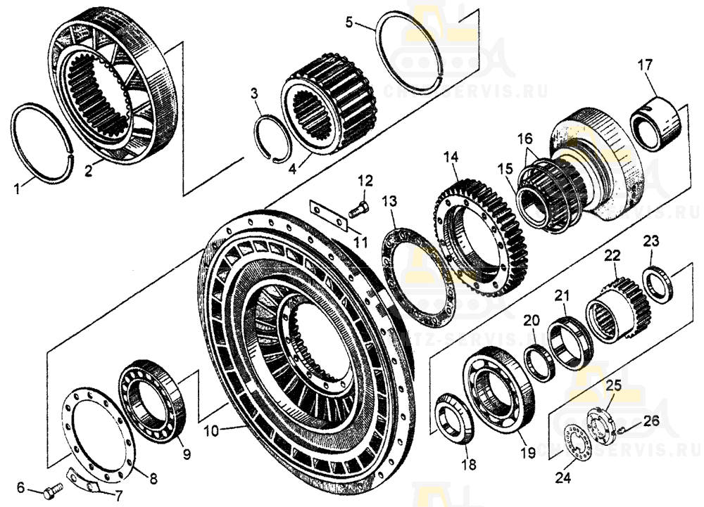 | 1 Для 64-14-101СП Гидротрансформатор. 2 Для 64-14-101-01СП Гидротрансформатор. 3 Входит в 64-14-123СП Ось. 4 Входит в 64-14-108СП Ступица. | |||
