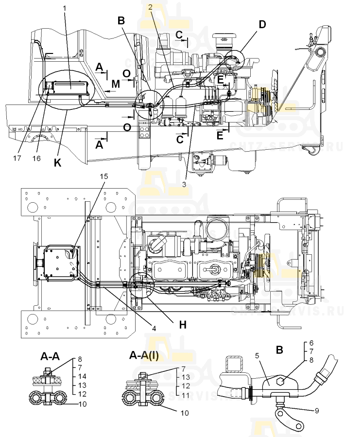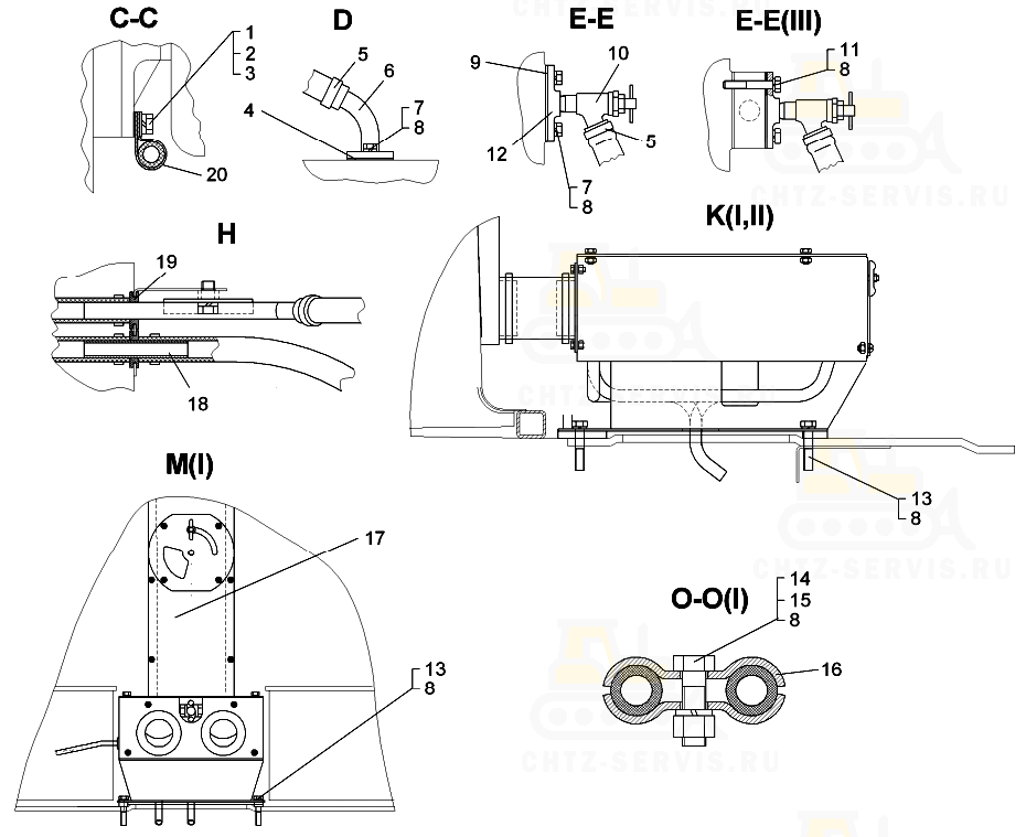 | 1 Для тропиков. Детали поз. 2-6. 8-14 для тропиков не устанавливаются. 2 Для трактора с гидромеханической трансмиссией. 3 При установке подогревателя Thermo 90 STD Webasto. 4 Для трактора с механической трансмиссией. | |||