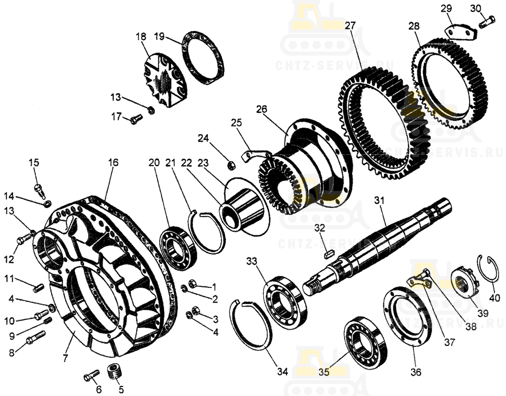 Кожух, полуось, подшипники, ступица, шестерни Т10М Б10М ЧТЗ