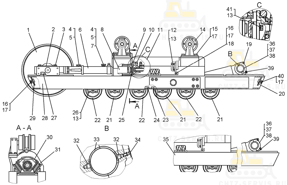 1 Для пятикатковой тележки с усиленной рамой под установку бульдозерного оборудования. 2 Для шестикатковой тележки с усиленной рамой под установку бульдозерного оборудования. 3 Для семикатковой тележки. 4 Для семикатковой тележки с усиленной рамой под установку бульдозерного оборудования.